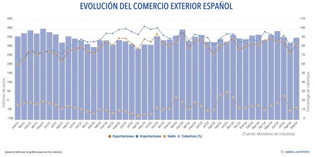 Como consecuencia, el saldo comercial español arroja un déficit de 3.291,3 millones de euros, frente al de 3.838,4 millones de euros de hace un año, con una tasa de cobertura del 90,6%, 1,6 puntos porcentuales más que en septiembre de 2023.