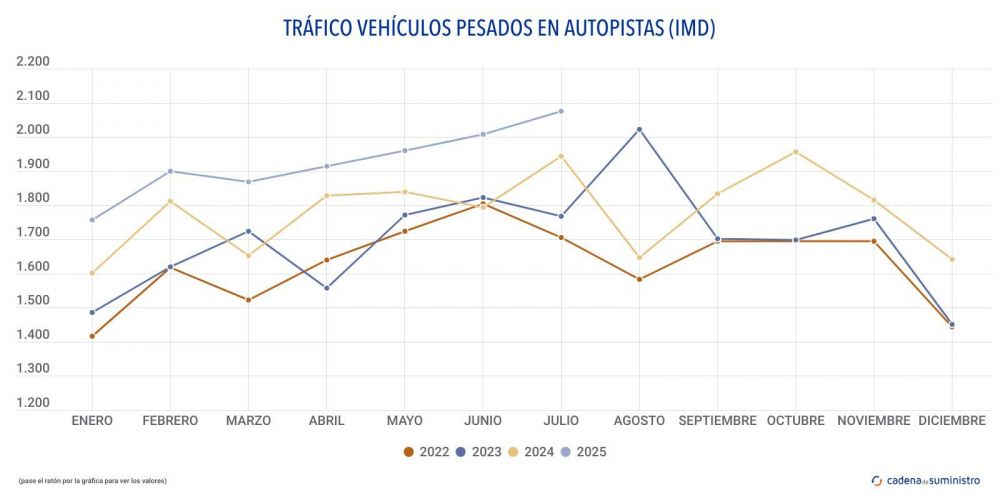 Dicha cifra indica que el tráfico pesado de las autopistas de peaje del país constituye el 10,3% del total de vehículos que han utilizado estas vías a diario durante el período, que, según los últimos datos reportados por el Ministerio de Transportes y Movilidad Sostenible, suma un total de 20.168 vehículos al día de media, cifra que, a su vez, implica un ascenso anual de un 5,9%.