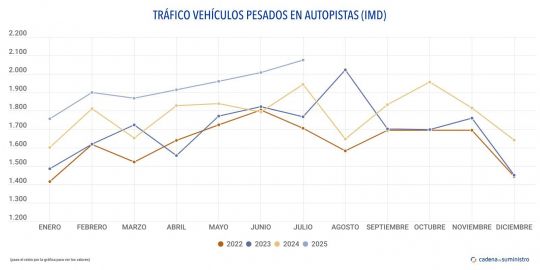 Durante el pasado mes de julio un promedio de 2.076 camiones ha circulado a diario por las autopistas de peaje del país, un 6,9% más que hace un año.