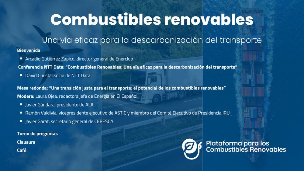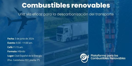 El próximo 3 de junio, la Plataforma para los Combustibles Renovables celebra una jornada bajo el título de 'Combustibles renovables: una vía eficaz para la descarbonización del transporte', en la sede del Club Español de la Energía.