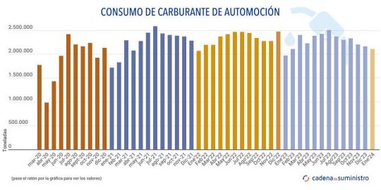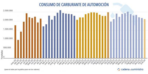 El consumo de carburantes de automoción se ha incrementado en un 6,9% en España en el primer mes de 2024, alcanzando las 2.103.000 toneladas, según el último informe de Cores, aunque desciende un 2,9% respecto a diciembre.