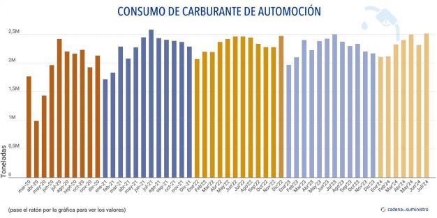 El consumo de carburantes de automoción se ha incrementando apenas un 0,4% en España en el séptimo mes de 2024, alcanzando las 2.514.000 toneladas, según el último informe de Cores, y un 2,6% en lo que va de año, con 16.486.000 toneladas.