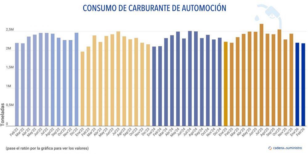 El consumo de carburantes de automoción en España se ha situado en las 2.187.000 toneladas en febrero de 2026 según el último informe de Cores, un 0,8% por debajo del dato del mismo mes del año anterior. Teniendo en cuenta los datos de los dos primeros meses del año, ya se ha registrado una caída del 1,1% en total.