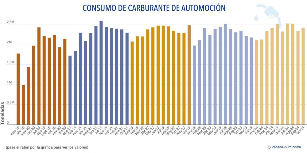Por su parte, el consumo de gasolinas se ha incrementado en un 7,3% en octubre hasta las 546.000 toneladas, y un 7,7% en los nueve primeros meses del año, con 5.463.000 toneladas.