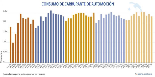 El consumo de carburantes de automoción ha descendido un 1,3% en España en noviembre, hasta las 2.289.000 toneladas, según el último informe de Cores, con un incremento del 2,2% desde enero, llegando hasta las 26.004.000 toneladas.