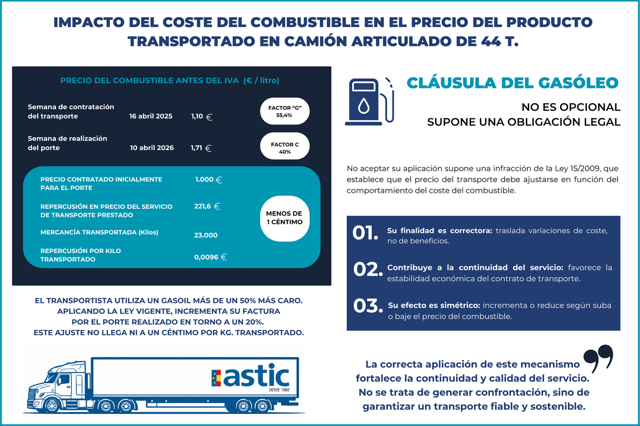 Con datos de la calculadora del Ministerio de Transportes y Movilidad Sostenible, entre la semana del 16 de abril de 2025 y la del 10 de abril de 2026, el precio del gasóleo -antes del IVA- ha pasado de 1,10 euros a 1,71 euros por litro, lo que supone un incremento del 55,4%. En un camión articulado con una masa máxima autorizada de 44 toneladas, el coeficiente “C” (porcentaje del coste del transporte que corresponde al combustible) es del 40%.
