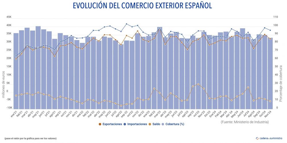 Como consecuencia, el saldo comercial español arroja un déficit de 5.131,3 millones de euros, frente al de 2.425,9millones de euros de hace un año, con una tasa de cobertura del 86,4%, 7,1 puntos porcentuales menos que en noviembre de 2023.