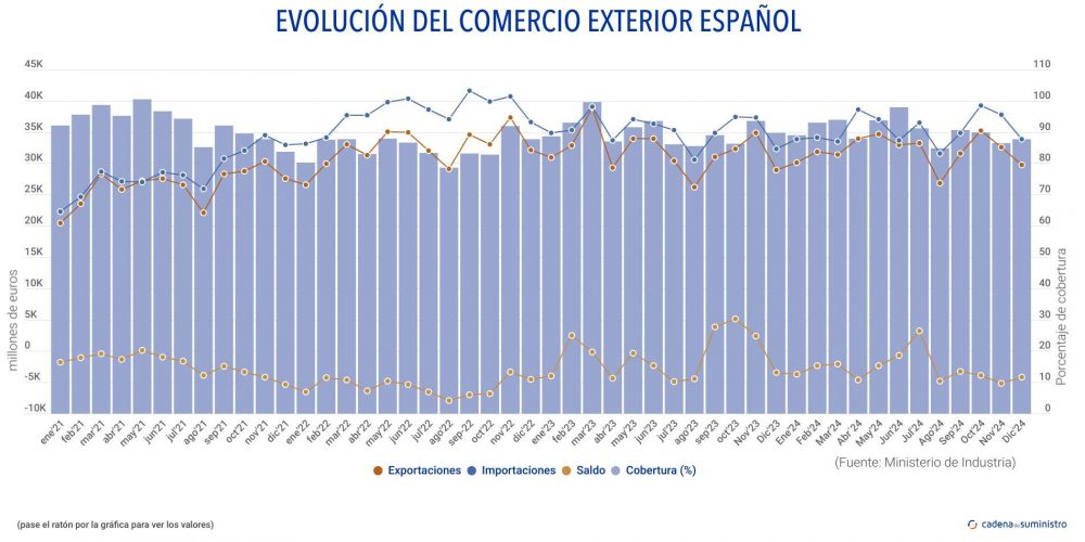 Como consecuencia, el saldo comercial español arroja un déficit de 4.121,5 millones de euros, frente al de 3.401,9 millones de euros de hace un año, con una tasa de cobertura del 87,8%,1,7 puntos porcentuales menos que en diciembre de 2023.