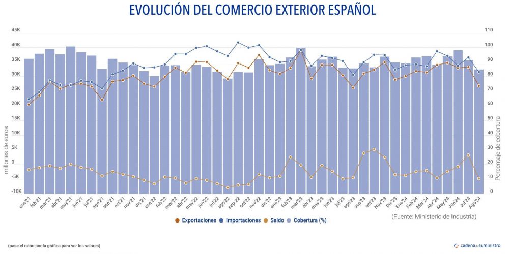 Como consecuencia, el saldo comercial español arroja un déficit de 4.763,4 millones de euros, frente al de 4.435,1 millones de euros de hace un año, con una tasa de cobertura del 84,9%, seis décimas porcentuales menos que en agosto de 2023.