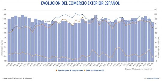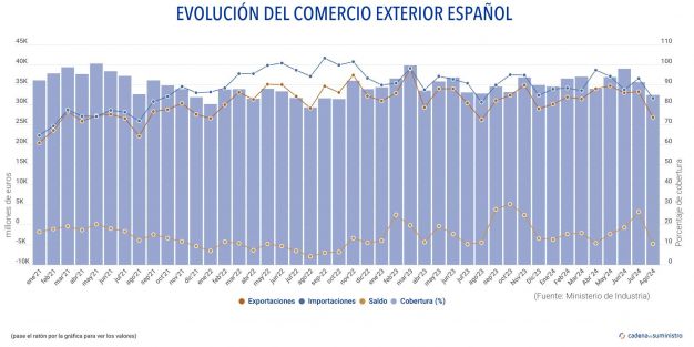 Así pues, el déficit comercial español en los ocho primeros meses de 2024 es de 23.799,7 millones de euros, frente a los 25.758,1 millones de euros de hace un año, con una tasa de cobertura de un 91,5%, seis décimas porcentuales por encima del registro del mismo período de 2023.