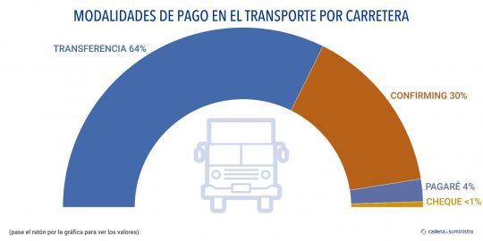 En cuanto a los medios de pago utilizados más habitualmente para el pago de los servicios de transporte, continúan siendo por este orden, la transferencia (64%), seguido del confirming (30%), el pagaré (5%) y el cheque (<1%).