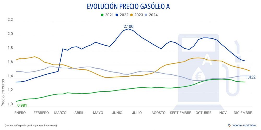 El precio del gasóleo se ha situado en los 1,432 euros de media en España en la semana del 10 al 16 de diciembre de 2024, un 0,06% por encima de los 1,431 de la semana anterior, según recoge el último Boletín Petrolero de la Unión Europea.