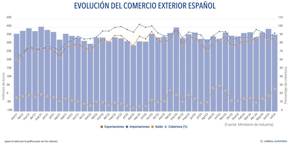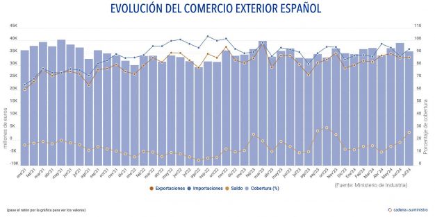 Como consecuencia, el saldo comercial español arroja un déficit de 3.213,8 millones de euros, frente al de 4.902,6 millones de euros de hace un año, con una tasa de cobertura del 91,2%, 5,1 puntos porcentuales más que en julio de 2023.