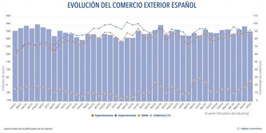 Así pues, el déficit comercial español en los siete primeros meses de 2024 es de 19.036,2 millones de euros, frente a los 38.273,4 millones de euros de hace un año, con una tasa de cobertura de un 92,3%, 1,4 puntos porcentuales por encima del registro del mismo período de 2023.