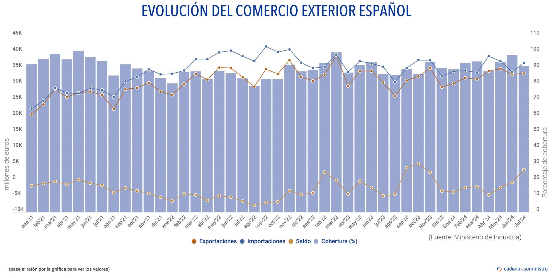 Así pues, el déficit comercial español en los siete primeros meses de 2024 es de 19.036,2 millones de euros, frente a los 38.273,4 millones de euros de hace un año, con una tasa de cobertura de un 92,3%, 1,4 puntos porcentuales por encima del registro del mismo período de 2023.