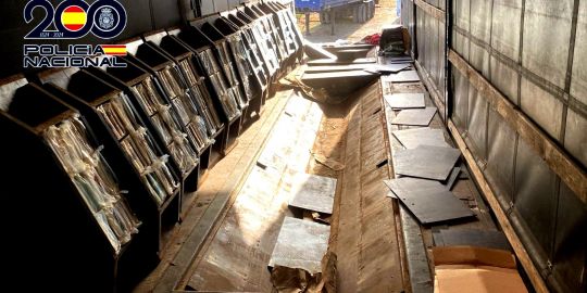 Tras identificar a los dos sospechosos, los agentes comprobaron que el suelo del interior del semi presentaba ciertas irregularidades que permitieron descubrir un compartimento oculto en el que se alojaban varios paquetes perfectamente ordenados.