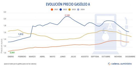 El precio del gasóleo se ha situado en los 1,512 euros de media en España en la semana del 30 de enero al 5 de febrero de 2024, lo que supone un ascenso del 1,13% respecto a los 1,495 euros de la semana anterior, según recoge el último Boletín Petrolero de la Unión Europea.