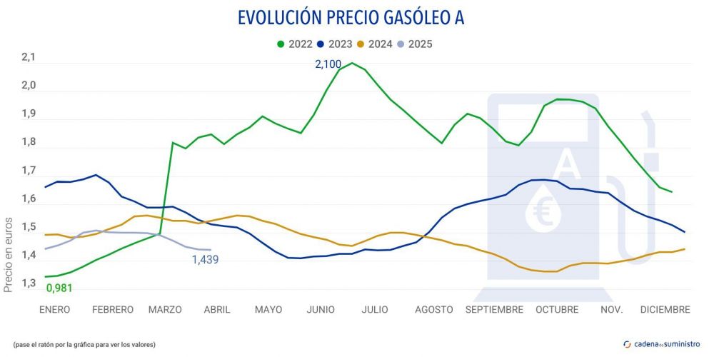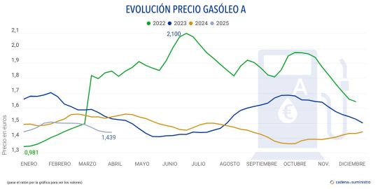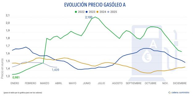 El precio del gasóleo se ha situado en los 1,439 euros de media en España en la semana del 25 al 31 de marzo de 2025, un 0,06% por debajo de los 1,440 del registro anterior, según recoge el último Boletín Petrolero de la Unión Europea.
