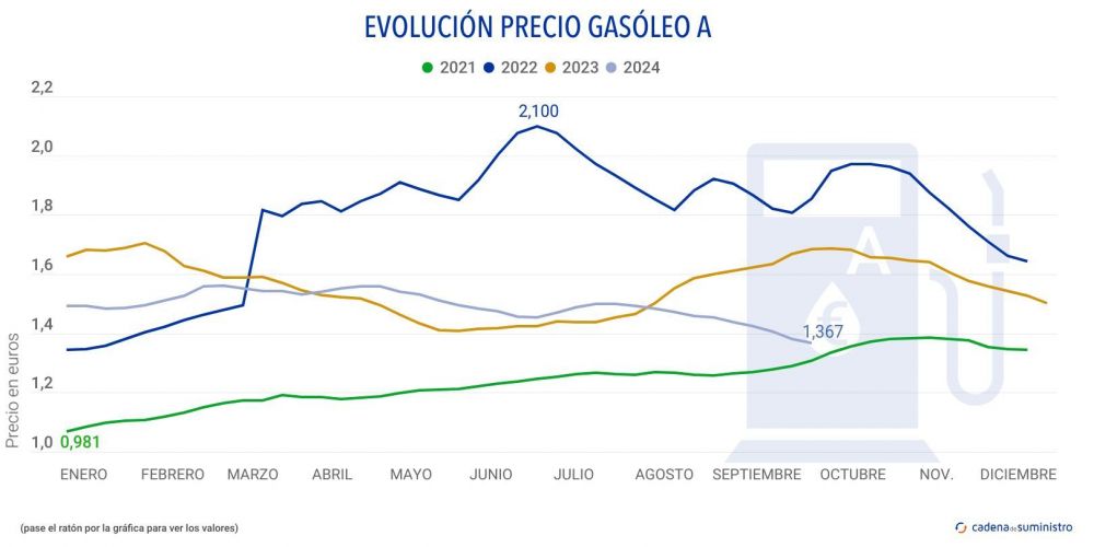 El precio del gasóleo se ha situado en los 1,367 euros de media en España en la semana del 17 al 23 de septiembre de 2024, lo que supone un descenso del 0,94% respecto a los 1,380 euros de la semana anterior. Encadena así su décima caída consecutiva, según recoge el último Boletín Petrolero de la Unión Europea.