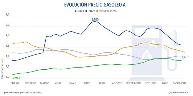 El precio del gasóleo se ha situado en los 1,431 euros de media en España en la semana del 3 al 9 de diciembre de 2024, manteniéndose en la línea de la semana anterior, según recoge el último Boletín Petrolero de la Unión Europea.