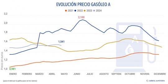 El precio del gasóleo se ha situado en los 1,541 euros de media en España en la semana del 23 al 29 de abril de 2024, un 1,09% por debao de los 1,558 euros de la semana anterior, según recoge el último Boletín Petrolero de la Unión Europea.