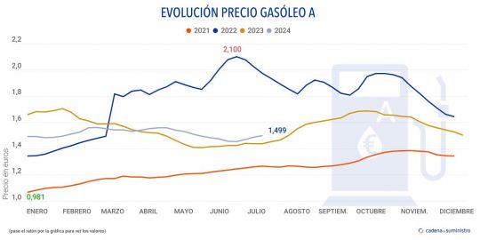 El precio del gasóleo se ha situado en los 1,499 euros de media en España en la semana del 2 de julio al 8 de julio de 2024, un 0,74% por encima de los 1,488 euros de la semana anterior, según recoge el último Boletín Petrolero de la Unión Europea.