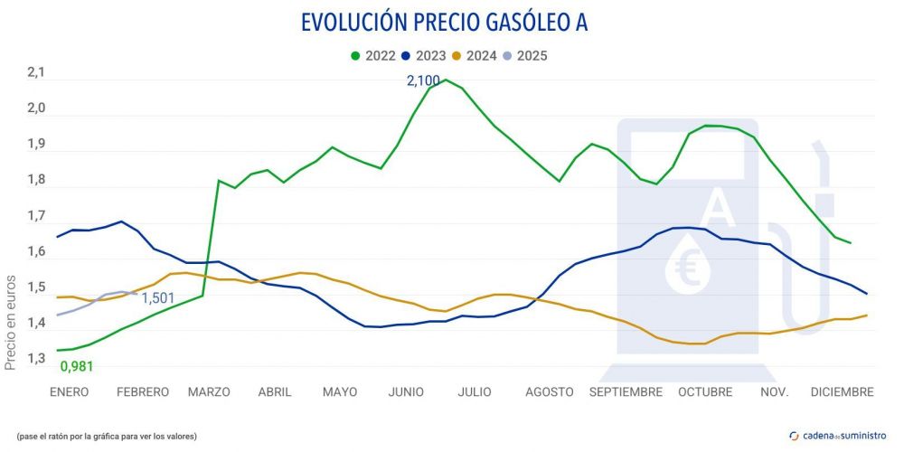 El precio del gasóleo se ha situado en los 1,501 euros de media en España en la semana del 28 de enero al 3 de febrero de 2025, un 0,46% por debajo de los 1,508 del registro anterior, según recoge el último Boletín Petrolero de la Unión Europea.