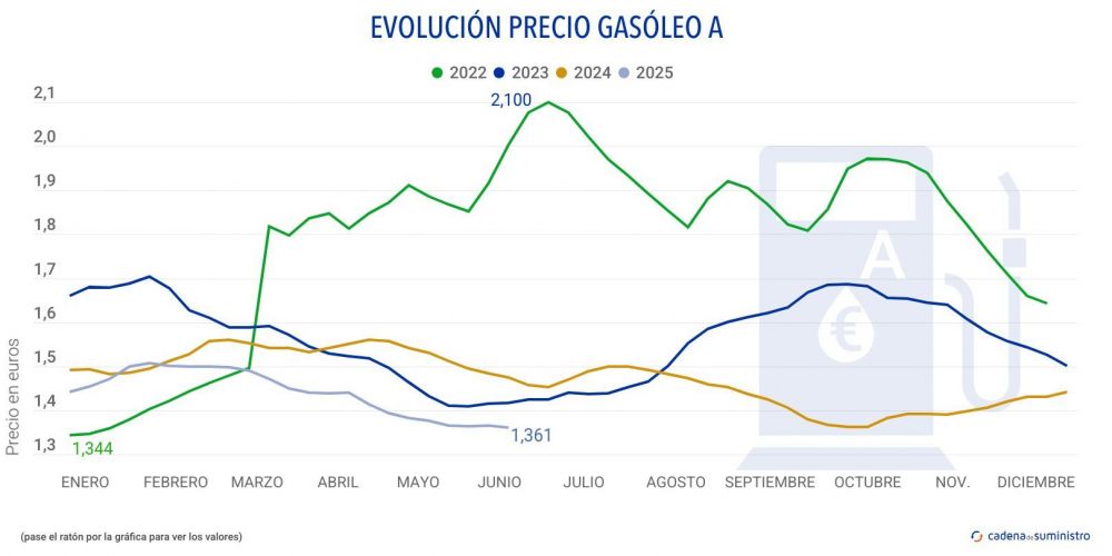 El precio del gasóleo se ha situado en los 1,361 euros de media en España en la semana del 27 de mayo al 2 de junio de 2025, un 0,29% por debajo de los 1,365 del registro anterior, según recoge el último Boletín Petrolero de la Unión Europea.