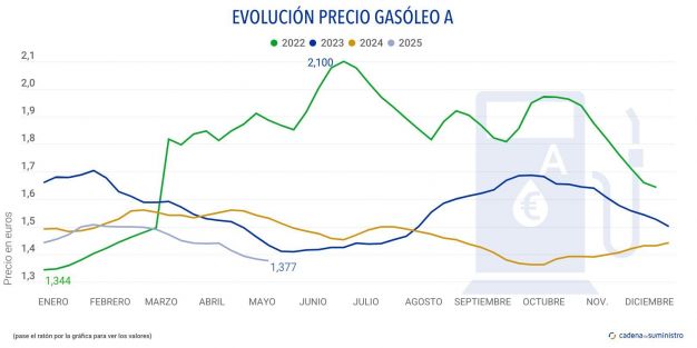 El precio del gasóleo se ha situado en los 1,377 euros de media en España en la semana del 29 de abril al 5 de mayo de 2025, un 0,43% por debajo de los 1,383 del registro anterior, según recoge el último Boletín Petrolero de la Unión Europea.