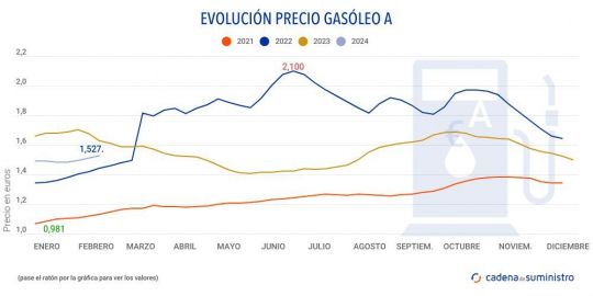 El precio del gasóleo se ha situado en los 1,527 euros de media en España en la semana del 6 al 12 de febrero de 2024, lo que supone un ascenso del 0,99% respecto a los 1,512 euros de la semana anterior, según recoge el último Boletín Petrolero de la Unión Europea.