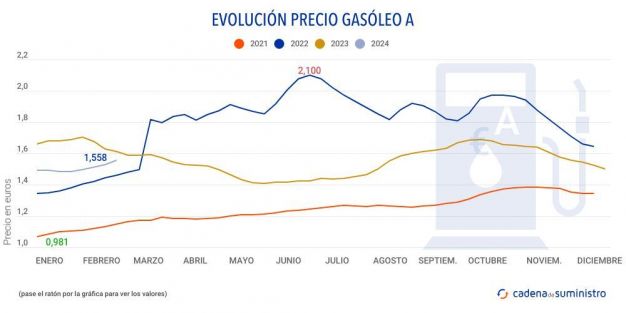 El precio del gasóleo se ha situado en los 1,558 euros de media en España en la semana del 13 al 19 de febrero de 2024, lo que supone un ascenso del 2,03% respecto a los 1,527 euros de la semana anterior, según recoge el último Boletín Petrolero de la Unión Europea.