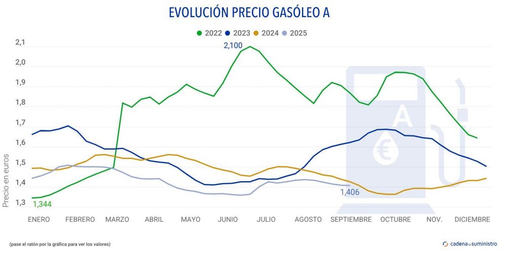 El precio del gasóleo se ha situado en los 1,406 euros de media en España en la semana del 26 de agosto al 1 de septiembre de 2025, un 0,07% por debajo de los 1,407 del registro anterior, según recoge el último Boletín Petrolero de la Unión Europea.