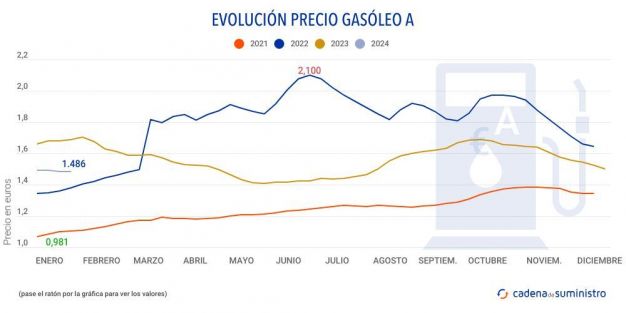 El precio del gasóleo se ha situado en los 1,486 euros de media en España en la semana del 16 al 22 de enero de 2024, lo que supone un pequeño ascenso del 0,2% respecto a los 1,483 euros de la semana anterior, según recoge el último Boletín Petrolero de la Unión Europea.