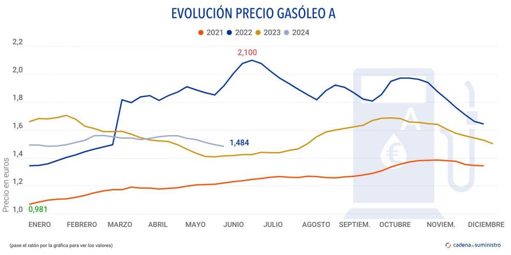 El precio del gasóleo se ha situado en los 1,484 euros de media en España en la semana del 21 al 27 de mayo de 2024, un 0,73% por debajo de los 1,495 euros de la semana anterior, según recoge el último Boletín Petrolero de la Unión Europea.