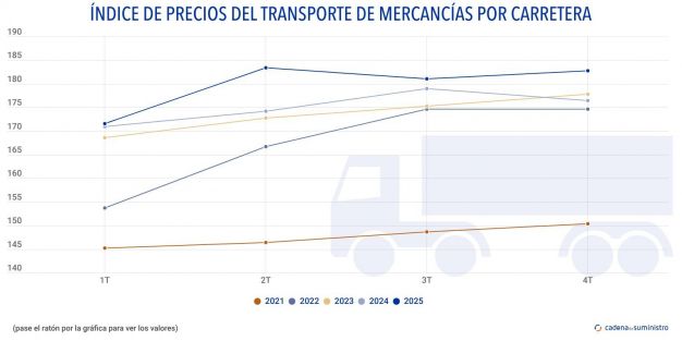 En el conjunto del año 2025, los precios del transporte de mercancías por carretera terminan con un índice de 179,6%, un 2,57% más que en 2024.