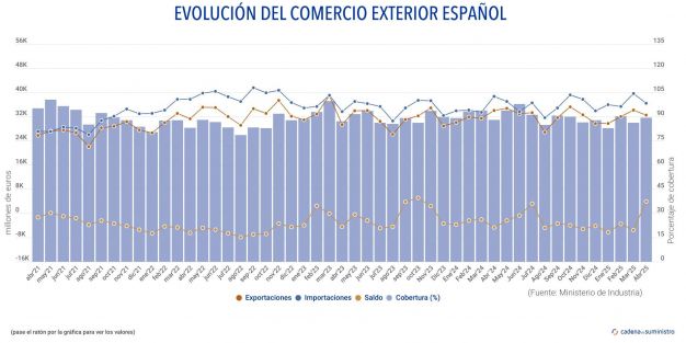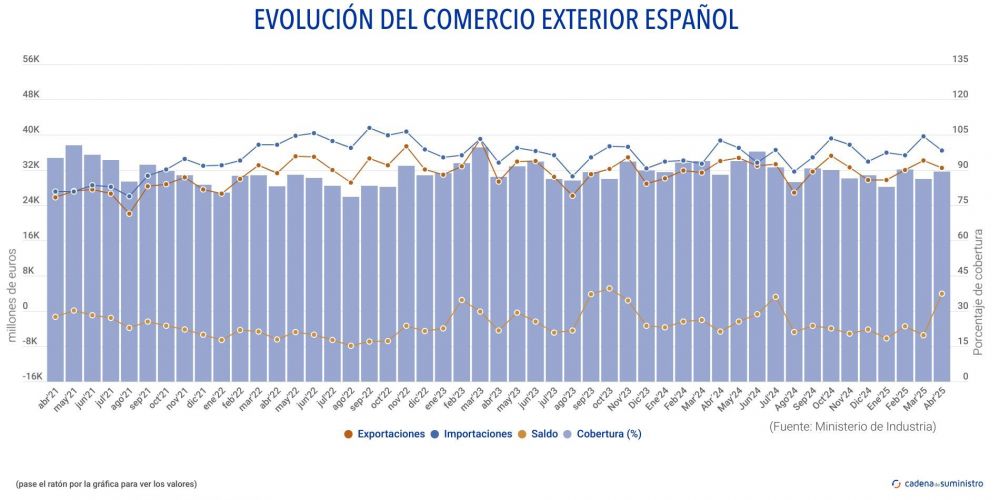 Como consecuencia, el saldo comercial español arroja un déficit de 3.882,4 millones de euros, frente al de 4.655,8 millones de euros de hace un año, con una tasa de cobertura del 89,3%, 1,3 puntos porcentuales más que en abril de 2024.