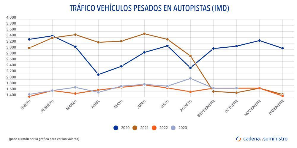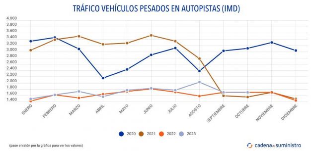 Dicha cifra indica que el tráfico pesado de las autopistas de peaje del país constituye el 11,69% del total de vehículos que han utilizado estas vías a diario durante el período, que, según los últimos datos reportados por el Ministerio de Transporte, Movilidad y Agenda Urbana, suma un total de 14.531 vehículos al día de media, cifra que, a su vez, implica un ascenso anual de un 6,66%.