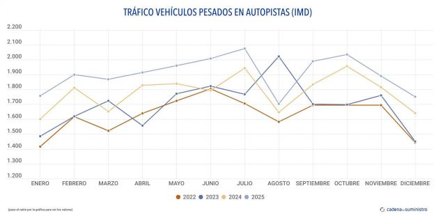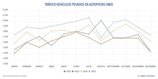 Durante el pasado 2025 un promedio de 1.904 camiones ha circulado a diario por las autopistas de peaje del país, un 6,9% más que un año antes.