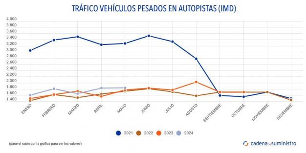 Dicha cifra indica que el tráfico pesado de las autopistas de peaje del país constituye el 12,01% del total de vehículos que han utilizado estas vías a diario durante el período, que, según los últimos datos reportados por el Ministerio de Transportes y Movilidad Sostenible, suma un total de 15.319 vehículos al día de media, cifra que, a su vez, implica un ascenso anual de un 7,04%.
