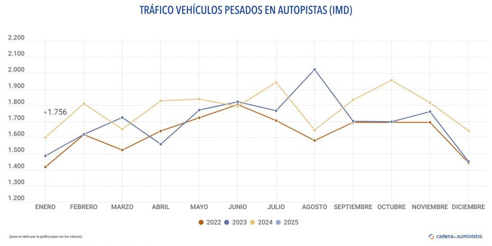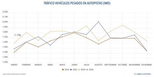 En este mismo sentido, durante el primer mes de 2025 se registró en las carreteras de pago del país un total de 77 millones de vehículos pesados kilómetro, un 10% más que en el mismo período de 2023.