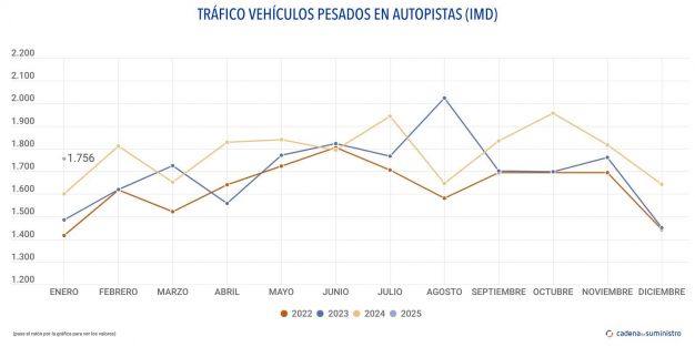 Dicha cifra indica que el tráfico pesado de las autopistas de peaje del país constituye el 13,43% del total de vehículos que han utilizado estas vías a diario durante el período, que, según los últimos datos reportados por el Ministerio de Transportes y Movilidad Sostenible, suma un total de 13.073 vehículos al día de media, cifra que, a su vez, implica un ascenso anual de un 6,64%.