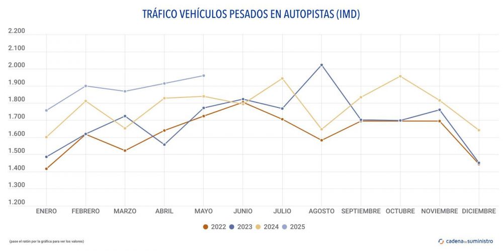 Dicha cifra indica que el tráfico pesado de las autopistas de peaje del país constituye el 12,03% del total de vehículos que han utilizado estas vías a diario durante el período, que, según los últimos datos reportados por el Ministerio de Transportes y Movilidad Sostenible, suma un total de 16.297 vehículos al día de media, cifra que, a su vez, implica un ascenso anual de un 6,38%.