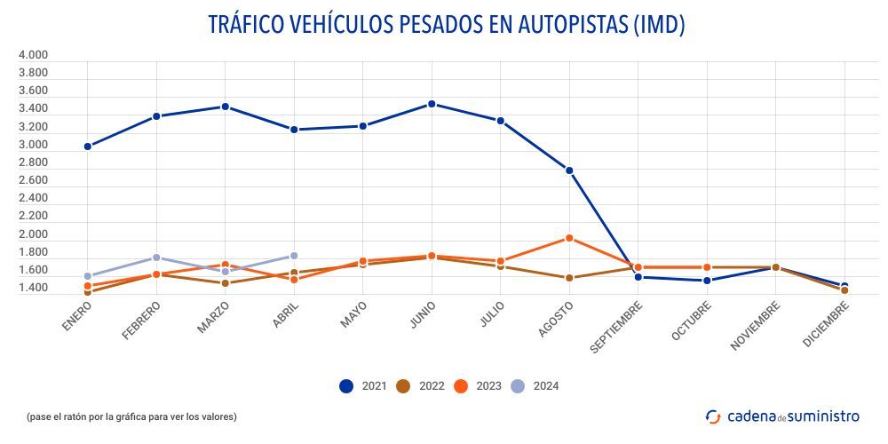 Dicha cifra indica que el tráfico pesado de las autopistas de peaje del país constituye el 12,43% del total de vehículos que han utilizado estas vías a diario durante el período, que, según los últimos datos reportados por el Ministerio de Transportes y Movilidad Sostenible, suma un total de 14.716 vehículos al día de media, cifra que, a su vez, implica un descenso anual de un 3,22%.