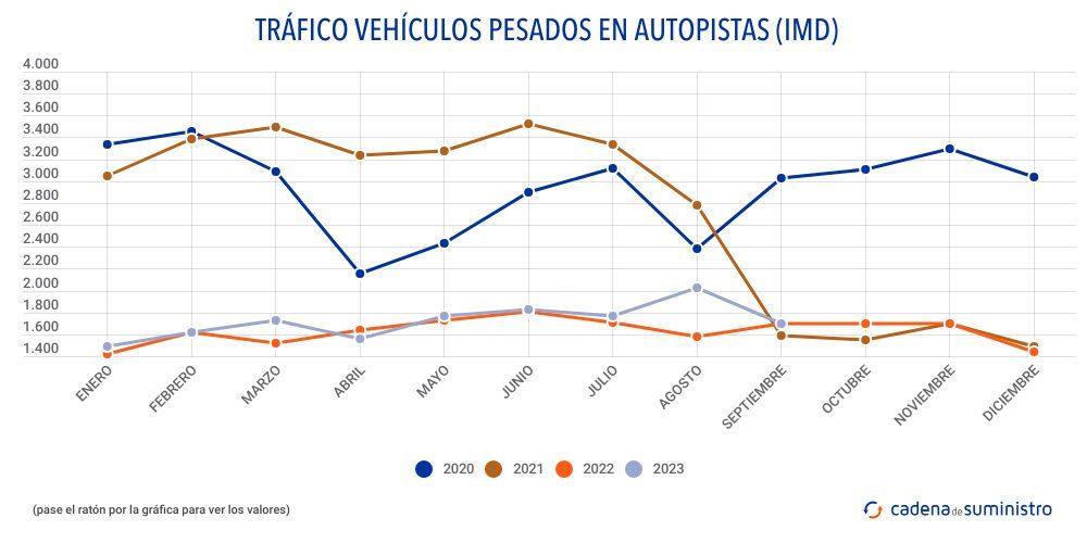Dicha cifra indica que el tráfico pesado de las autopistas de peaje del país constituye el 11,02% del total de vehículos que han utilizado estas vías a diario durante el período, que, según los últimos datos reportados por el Ministerio de Transporte, Movilidad y Agenda Urbana, suma un total de 15.439 vehículos al día de media, cifra que, a su vez, implica un ascenso anual de un 1,83%.