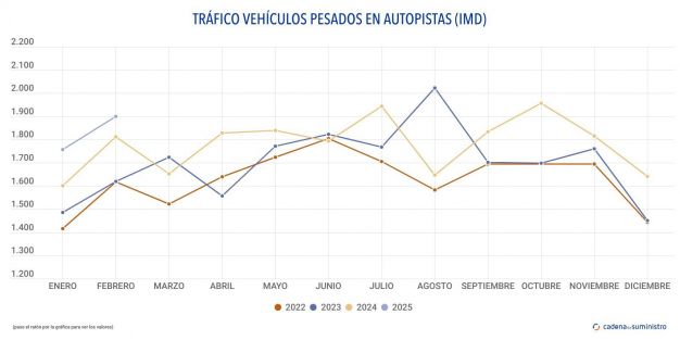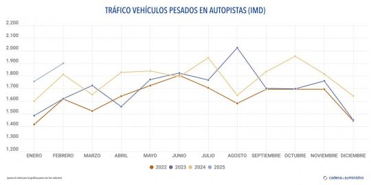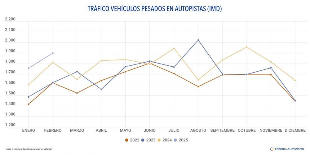 En este mismo sentido, durante el segundo mes de 2025 se registró en las carreteras de pago del país un total de 75 millones de vehículos pesados kilómetro, un 1,35% más que en el mismo período de 2023.