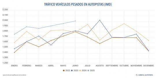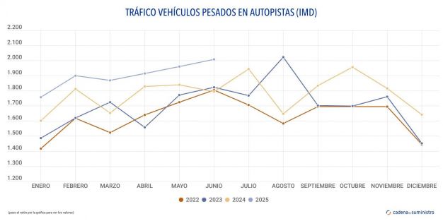 Dicha cifra indica que el tráfico pesado de las autopistas de peaje del país constituye el 11,29% del total de vehículos que han utilizado estas vías a diario durante el período, que, según los últimos datos reportados por el Ministerio de Transportes y Movilidad Sostenible, suma un total de 17.772 vehículos al día de media, cifra que, a su vez, implica un ascenso anual de un 9,76%.