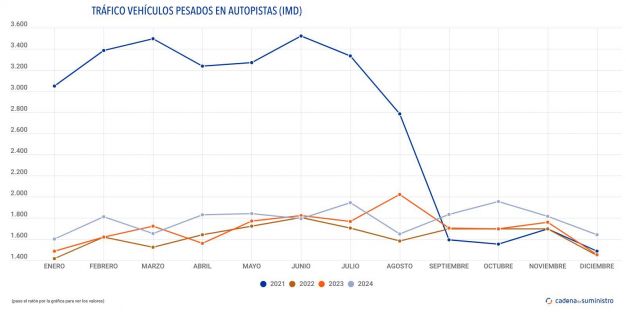 En este mismo sentido, durante el último mes de 2024 se registró en las carreteras de pago del país un total de 72 millones de vehículos pesados kilómetro, un 12,5% más que en el mismo período de 2023.