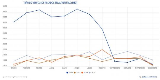 Dicha cifra indica que el tráfico pesado de las autopistas de peaje del país constituye el 11,18% del total de vehículos que han utilizado estas vías a diario durante el período, que, según los últimos datos reportados por el Ministerio de Transportes y Movilidad Sostenible, suma un total de 14.687 vehículos al día de media, cifra que, a su vez, implica un ascenso anual de un 7,44%.