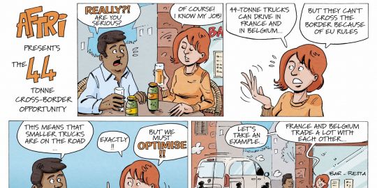 La asociación francesa Aftri ha recurrido a una historieta gráfica para denunciar con humor el sinsentido que tiene la prohibición del uso de vehículos de 44 toneladas entre dos países de la Unión europea que permiten su utilización en servicios nacionales.