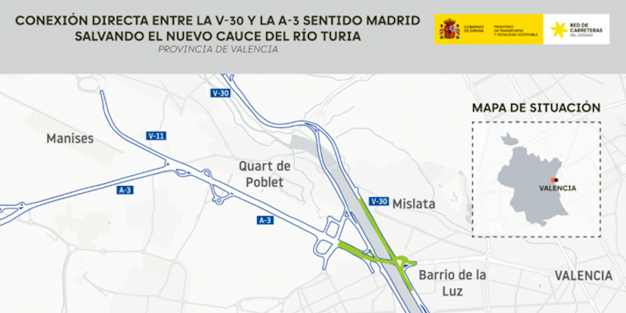 El Ministerio de Transportes y Movilidad Sostenible ha aprobado el expediente de información pública y definitivamente el proyecto de trazado de la conexión directa entre la V-30 y la A-3 salvando el nuevo cauce del río Turia, en Valencia, Xirivella y Mislata.